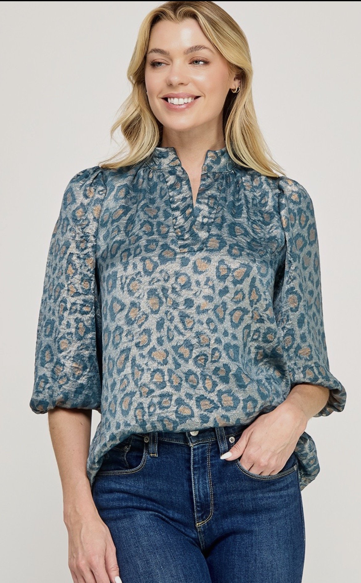 Shop › Foil leopard print top Image 1 of 1 Foil leopard print top $30.00 Vneck leopard print top Shirring along neckline and shoulder3/4 sleeve with elastic in opening Size: S M L Xl Get notified by email when this product is in stock. Quantity: Add To Cart Added! Vneck leopard print top Shirring along neckline and shoulder3/4 sleeve with elastic in opening